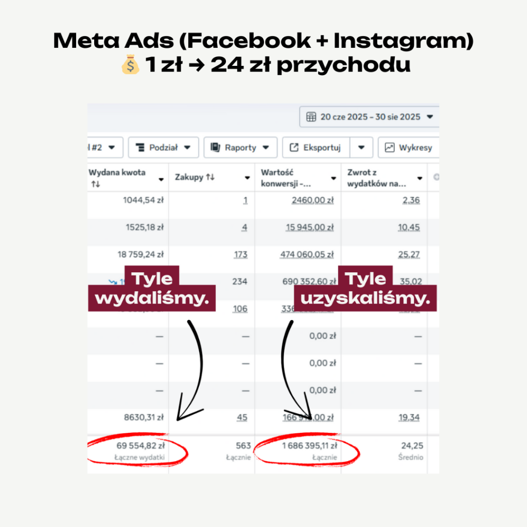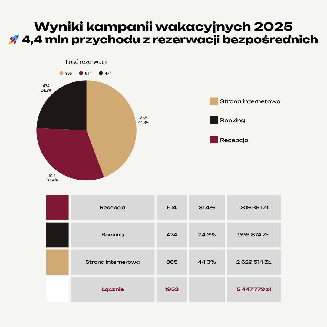 Kampanie zrealizowane w okresie od 20 czerwca do 31 sierpnia 2025 przyniosły spektakularny zwrot z inwestycji, uwzględniając wyłącznie rezerwacje dokonane przez stronę www.