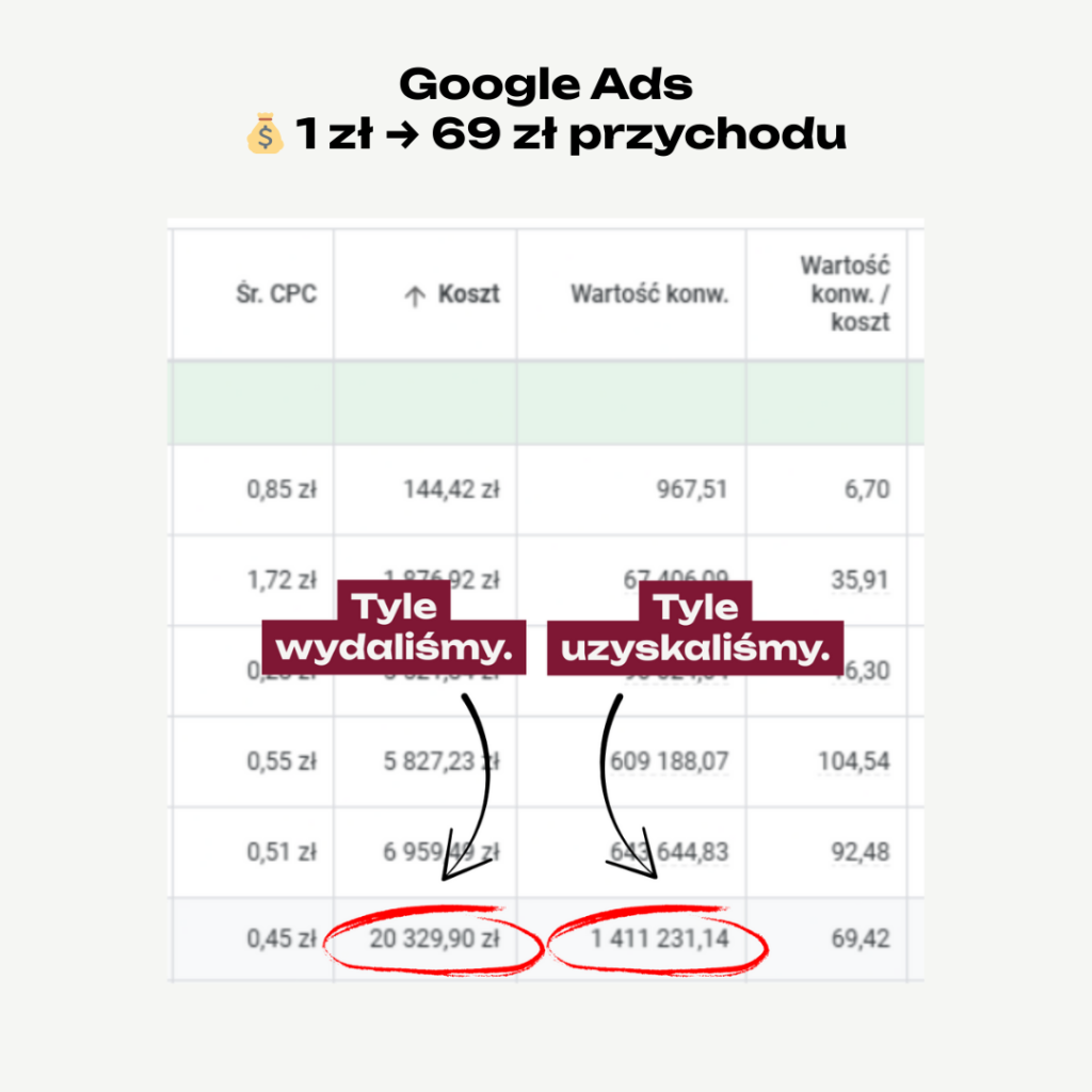 Z każdej 1 złotówki wydanje na reklame Google Ads